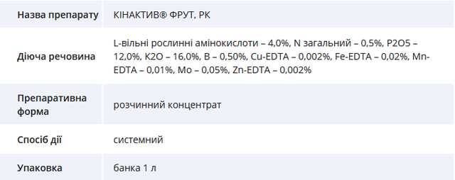 - найбільш ефективно застосовувати КІНАКТИВ ФРУТ у фазу активного росту плодів;