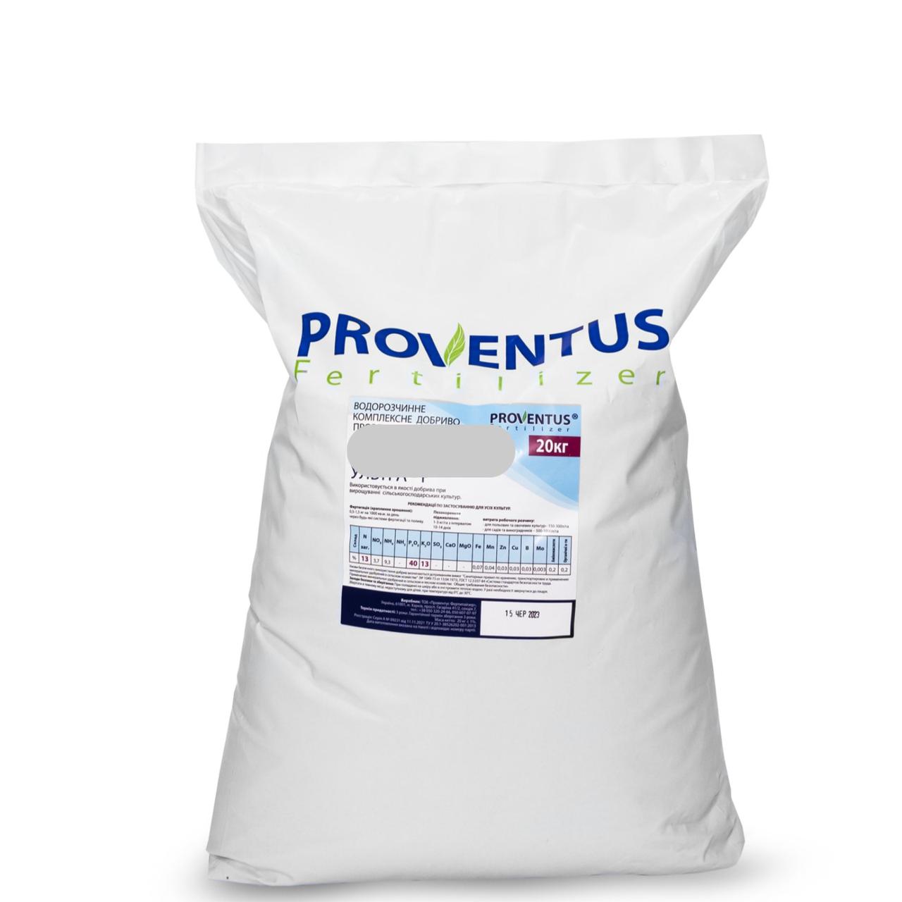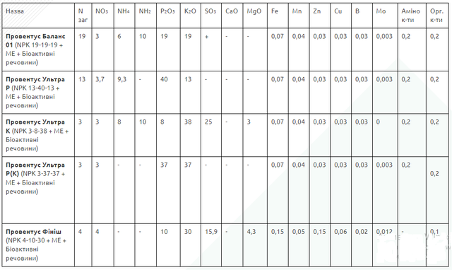 PROVENTUS – лінійка сухих порошкових водорозчинних NPK добрив з мікроелементами. Формуляції добрив, за співвідношенням елементів живлення, розраховані для використання на всіх сільськогосподарських культурах у різні фази онтогенезу в системах зрошення та фертигації відкритого й закритого грунту. Добрива забезпечують рослини повним комплексом елементів живлення, що створює передумови для максимального розкриття їх генетичного потенціалу. Добриво містить комплекс 100% хелатованих мікроелементів (Fe, Mn, Zn, Cu, B, Mo).