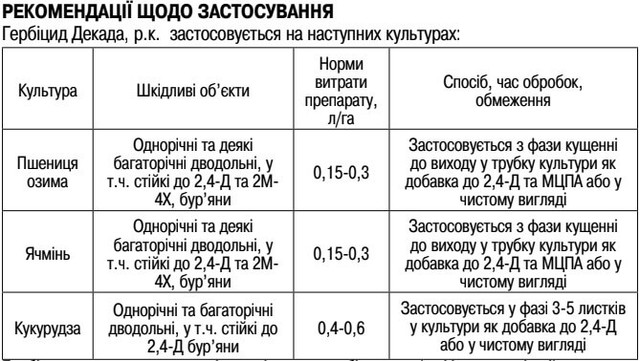 Післясходовий гербіцид Декада системної дії, призначений для боротьби з однорічними та багаторічними двосім’ядольними бур’янами в посівах сільськогосподарських культур.